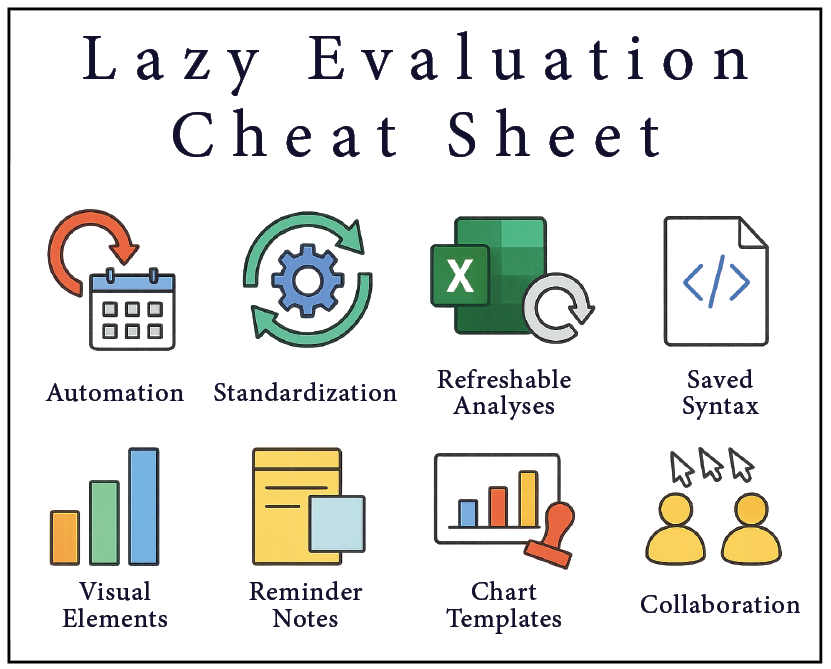 Streamlining evaluation is about making smart decisions so that you can avoid redoing the same work later. By automating routine steps, standardizing your tools, designing analyses that grow, streamlining chart design, taking good reminder notes, and collaborating efficiently, you can create more space for the parts of evaluation that matter most. Lazy evaluation is not about avoiding effort, but about being intentional in setting up processes that make your work easier, clearer, and more impactful.